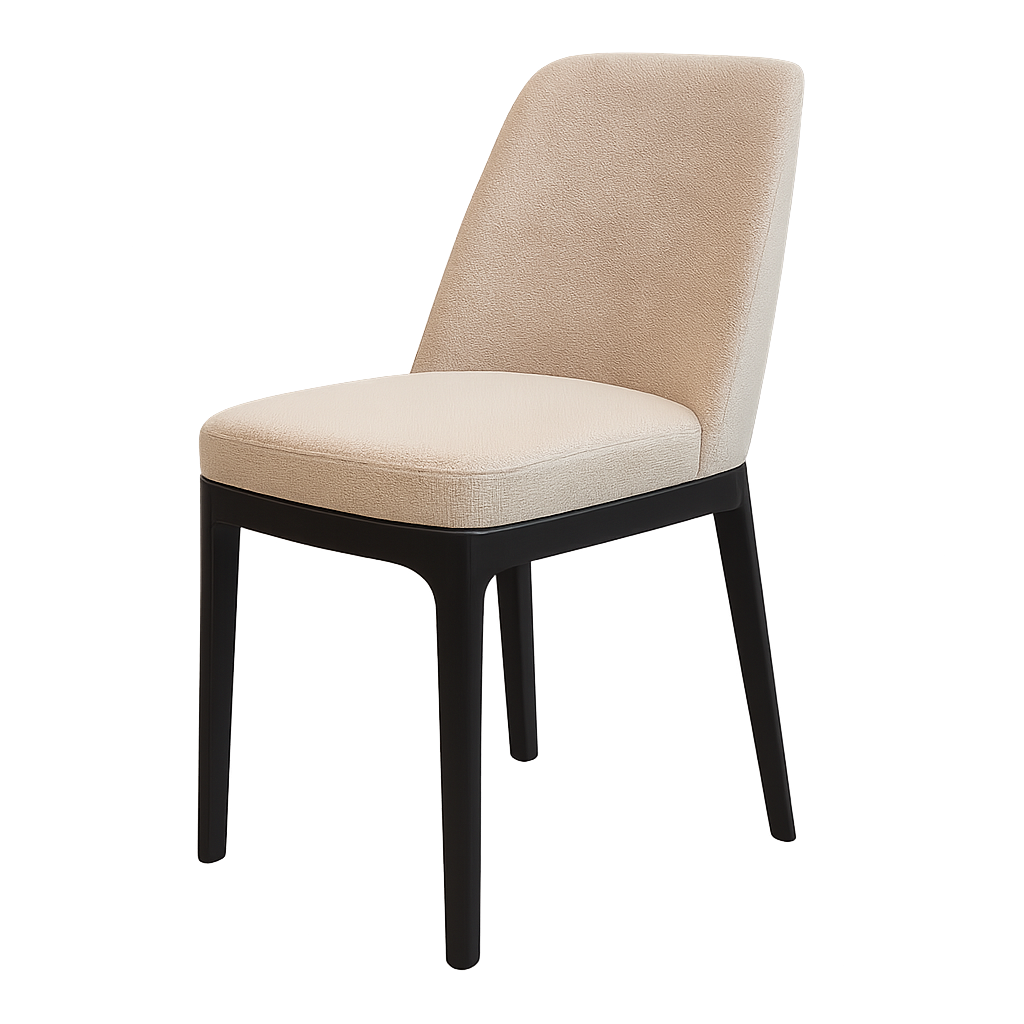 El asiento y el respaldo tienen un contorno cómodo y están tapizados con tela de alta calidad que combina suavidad y durabilidad. Las patas de madera sutilmente cónicas aportan estabilidad, y su color oscuro contrasta con la tapicería clara, creando un efecto atemporal y elegante.