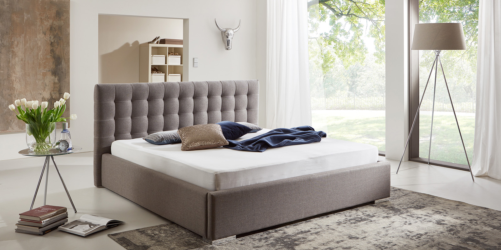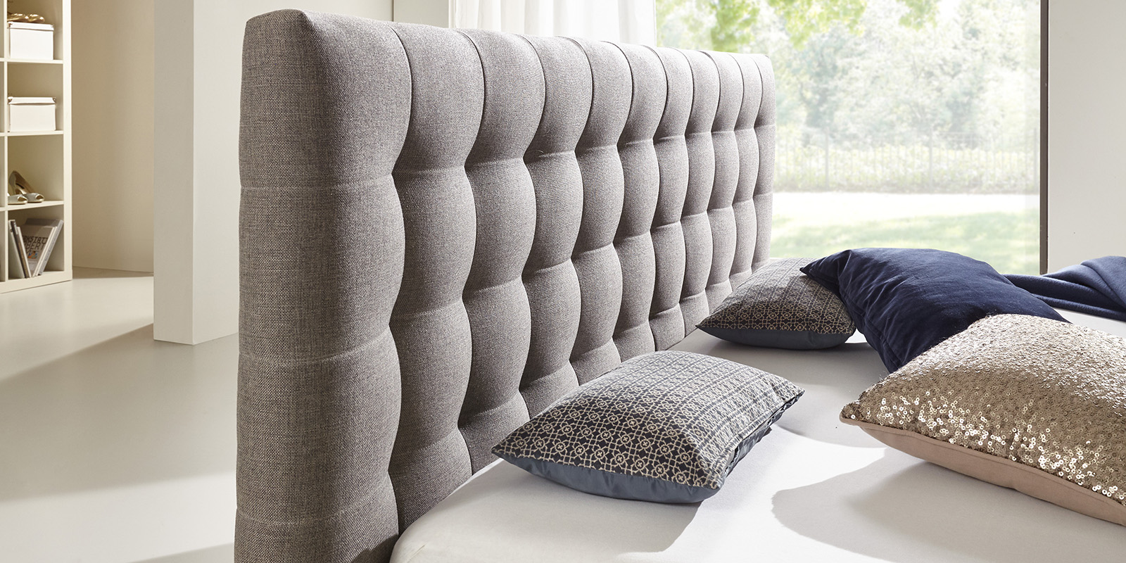 La tela VELLUTO es un terciopelo exclusivo con una textura agradable al tacto, resistente a la abrasión y fácil de limpiar. Su elegante brillo aporta un estilo único y un ambiente cálido a cualquier dormitorio.